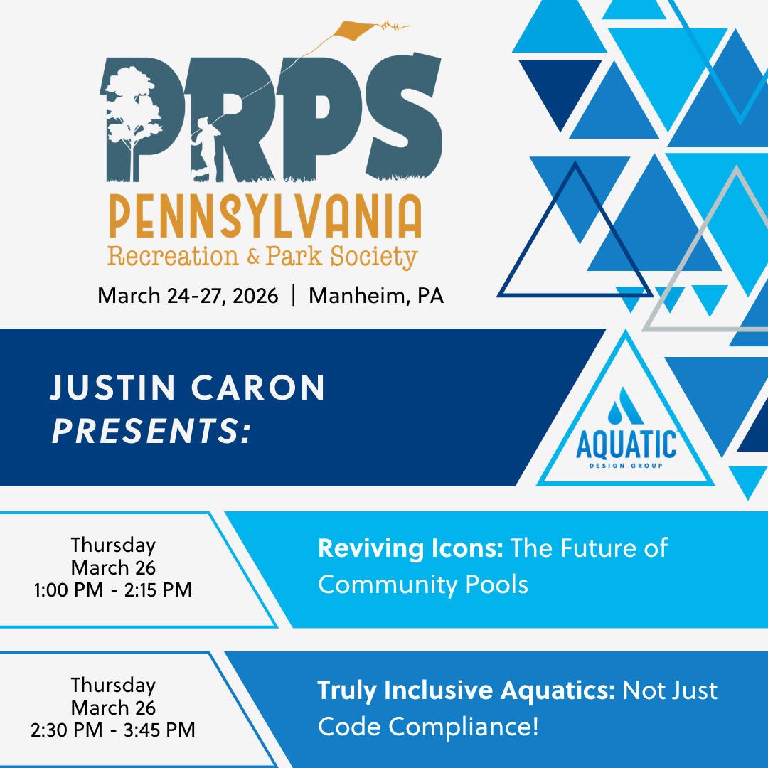 Don't miss Justin Caron’s debut in at the Pennsylvania Recreation & Parks Society 2026 Conference & Expo, speaking about inclusive aquatics and successful community pool renovations in Manheim, Pennsylvania on March 26!